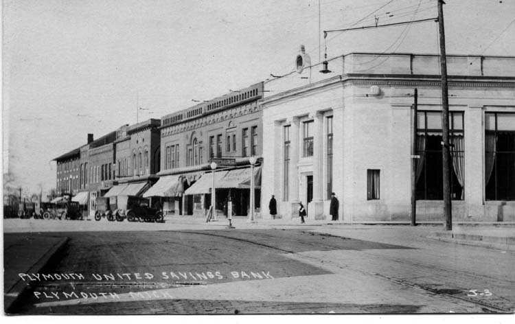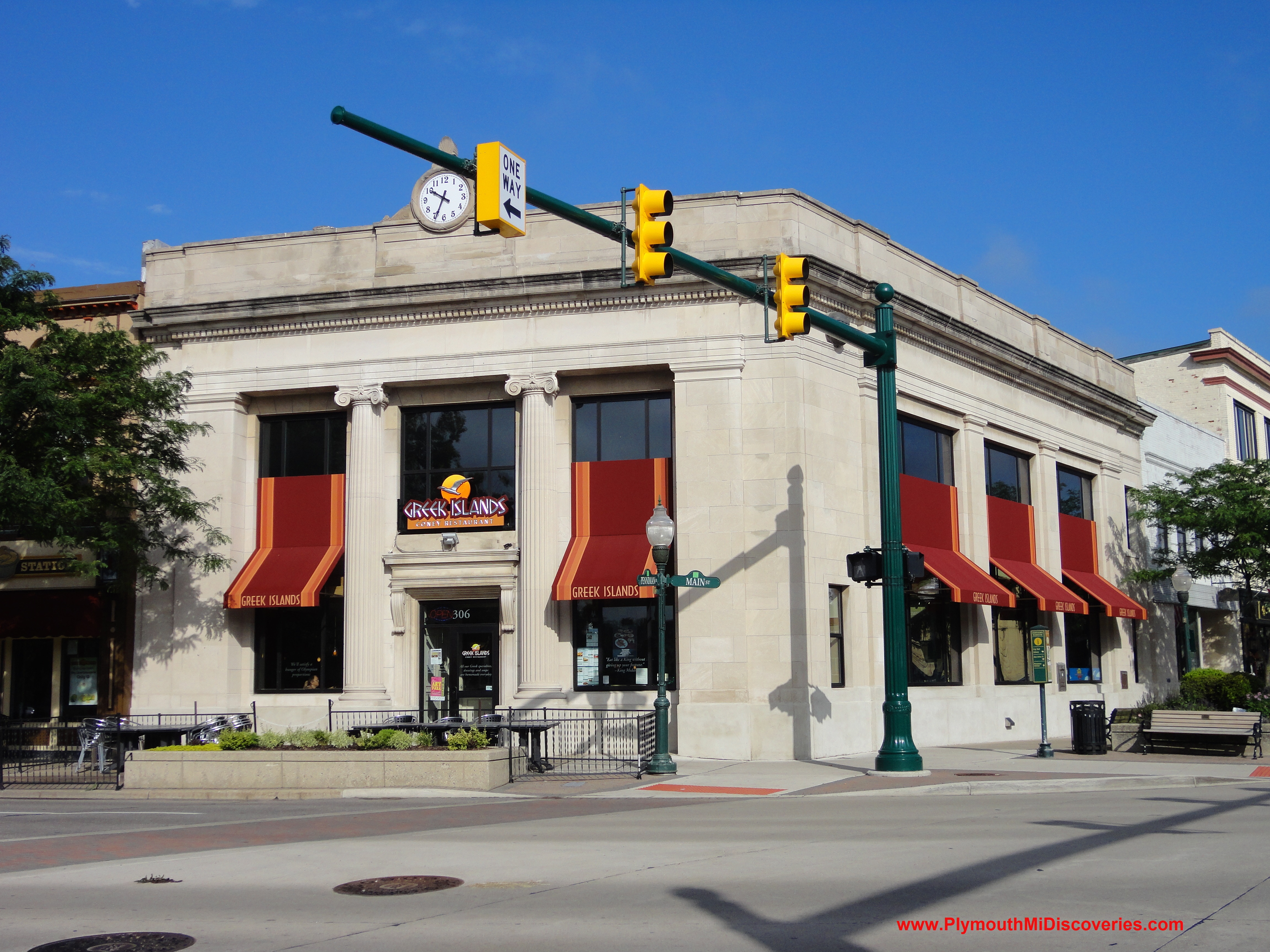 306 S. Main Street. Built in 1920. This Iconic Plymouth structure was originally built as the Plymouth United Savings Bank. There’s no missing this building when you’re in downtown Plymouth as it stands guard at the corner of Main and Penniman overlooking Kellogg Park. This bank was once run by some the most well known names in Plymouth’s history like: Bennett, Geer, Hough, Shearer, Starkweather, & Wilcox. This structure was built using solid materials like Limestone. This bank was built on the same spot where the old Coleman building once stood. This building operated as a bank until 1994 when it was sold. It has since seen a couple of different occupants and is currently home to the Greek Islands Restaurant.